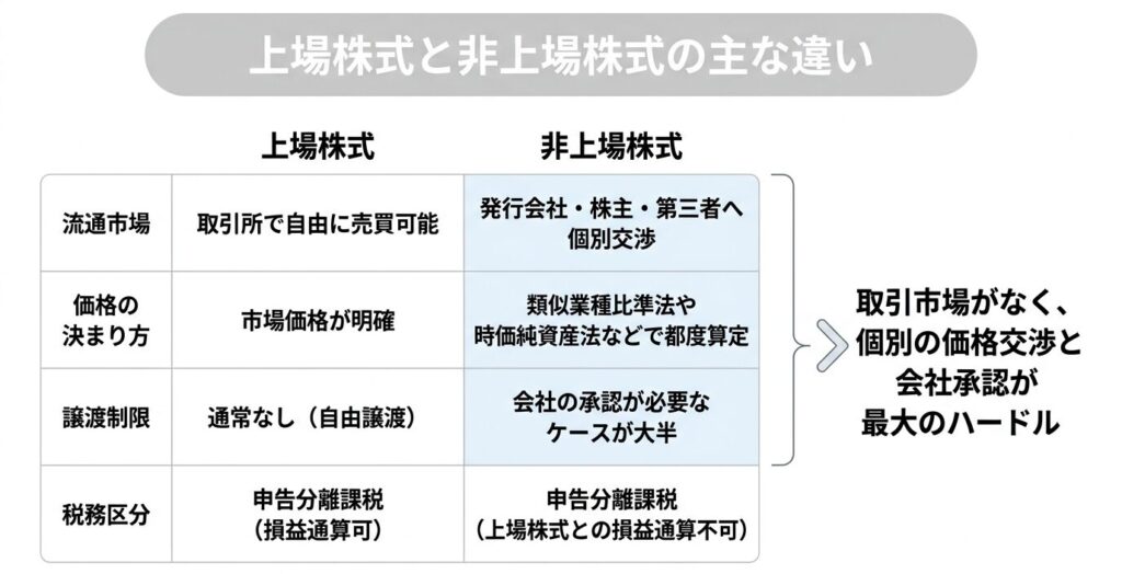 | 流通市場 | 取引所で自由に売買 | 発行会社・既存株主・第三者へ個別交渉 |