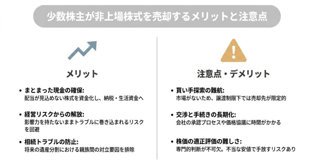 もっとも、非上場株式の売却は、メリットだけでなく固有のリスクや制約も伴います。そのため、売却を検討する際には、利点と注意点の双方を理解したうえで判断することが重要です。