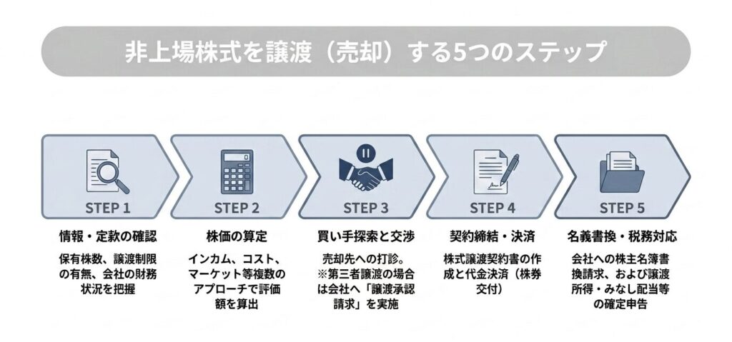 本記事では、売却先(会社・既存株主・第三者)ごとの進め方、承認手続から契約・名義書換までの流れ、売却時に問題になりやすい税金まで、順を追って解説します。